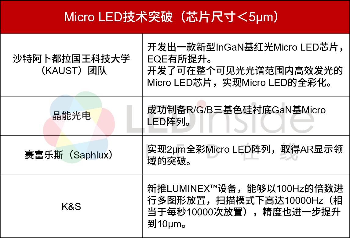 可喜的是,这一年来全球Micro LED厂商在红光芯片功率、巨量搬运和全彩化问题上获得了较为明显的效果,在必定程度上点着了企业、出资者和顾客对Micro LED的决心。