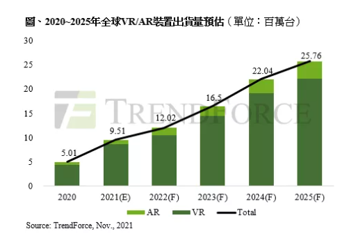 作为元国际与实际国际完成交互的窗口,AR/VR设备在短短半年多的时刻里如漫山遍野般出现。TrendForce集邦咨询预估,2022年全球AR/VR设备出货量将上看1202万台,年增长率达26.4%。